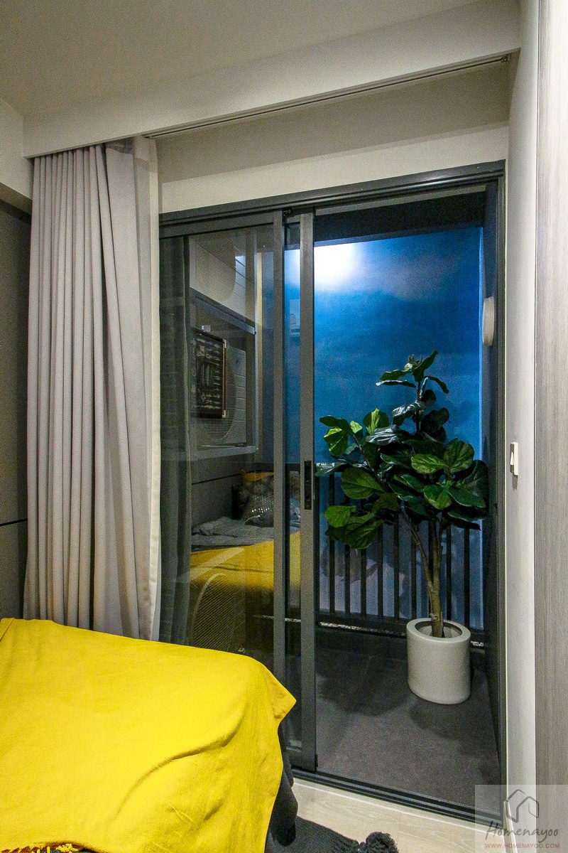 ภายในห้องนอนจะได้หน้าต่างกระจกใสตัดแสง กรอบอะลูมิเนียมสีเทา แบบ Full Height เต็มผนังห้อง โดยจะแบ่งเป็นแบบบานฟิกซ์ ไว้รับแสงธรรมชาติในตอนกลางวัน และ มีบานกระทุ้งทรงสูง ไว้เปิดรับลม ระบายอากาศอีก 1 บาน