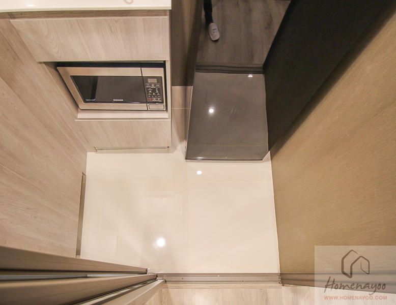 เดินเข้ามาแล้วมองกลับไปที่ประตูทางเข้า ขวามือตรงฝั่งห้องครัวจะมีตู้ไว้ให้วางเครื่องซักผ้า