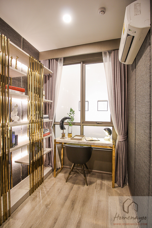 พื้นที่ห้องด้านในขนาดประมาณ 2 x 1.88 ม. พื้นที่สามารถทำเป็นห้องนอนได้อีกห้อง วางเตียง 3 ฟุตได้พอดี ส่วนห้องตัวอย่างทำเป็นห้องทำงานให้ดูเป็นไอเดียครับ วางโต๊ะทำงานไว้ริมหน้าต่าง