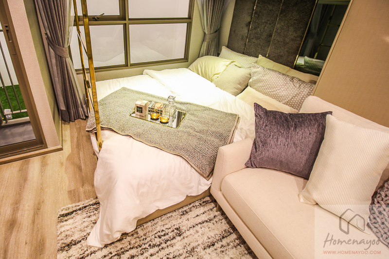 พื้นที่ถัดเข้ามาจะเป็นส่วนของห้องนั่งเล่นและห้องนอนใช้งานร่วมกัน เราสามารถปรับเปลี่ยนพื้นที่ได้ตามความต้องการ