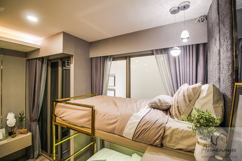 ห้องตัวอย่างแต่งห้องมาให้ดูเป็นไอเดีย ด้วยความที่ฝ้าสูง 3 ม. จึงวางเตียง 2 ชั้นมาให้ดูครับ วางโซฟาติดบันไดตรงบันไดขึ้นเตียงชั้น 2 ใช้พื้นที่ได้คุ้มดี หรือใครจะยกพื้นขึ้นและใช้เตียงที่สามารถยกขึ้นลงเพื่อเก็บของใต้เตียงก็ได้ครับ