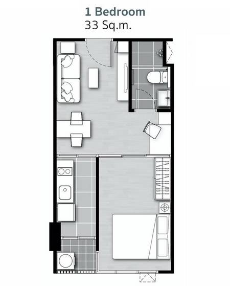แปลนห้อง 33 ตร.ม. รูปแบบแตกต่างจากห้องเมื่อสักครู่นี้พอสมควร ด้วยขนาดที่เพิ่มขึ้นจึงสามารถแบ่งพื้นที่แต่ละโซนให้เป็นสัดส่วนได้มากขึ้น โดยเฉพาะห้องครัวที่