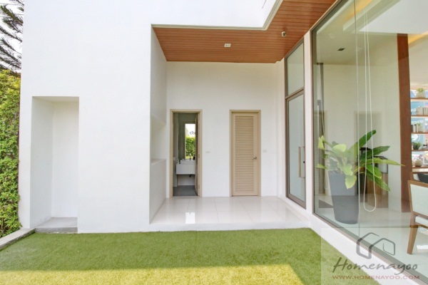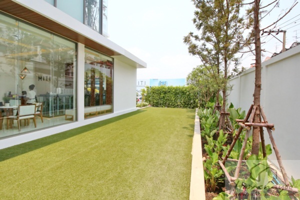พื้นที่สนามหญ้าเทียมด้านหลังนี้คือตำแหน่งของสระว่ายน้ำ
