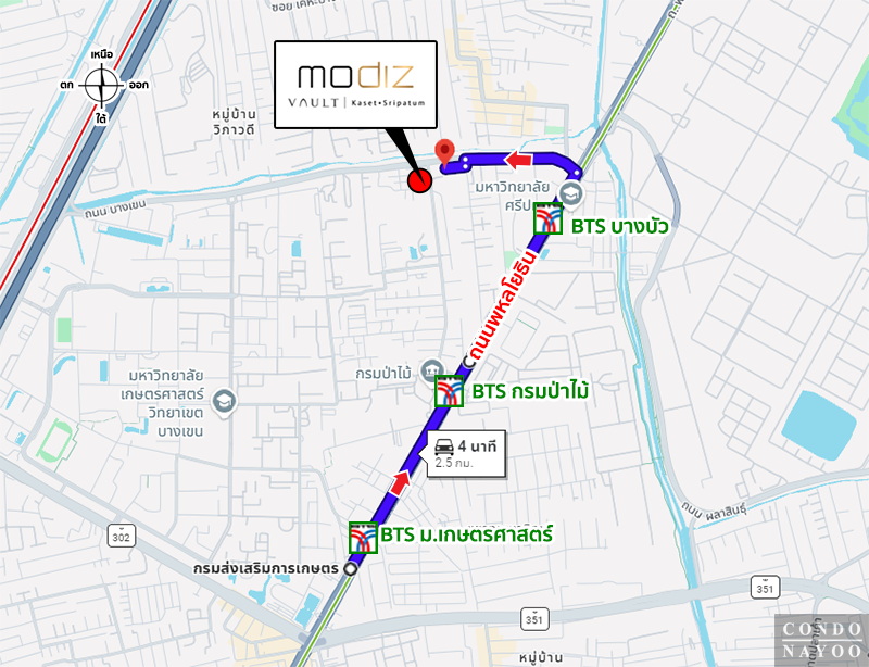 ถนนพหลโยธิน ⇒ ถนนบางเขน ⇒ ตรงเข้าไปประมาณ 550 ม.* ถึงโครงการ Modiz Vault เกษตร-ศรีปทุม ทางฝั่งซ้ายมือ