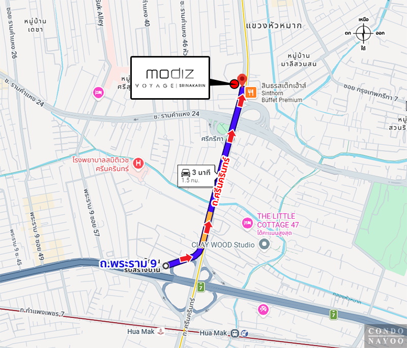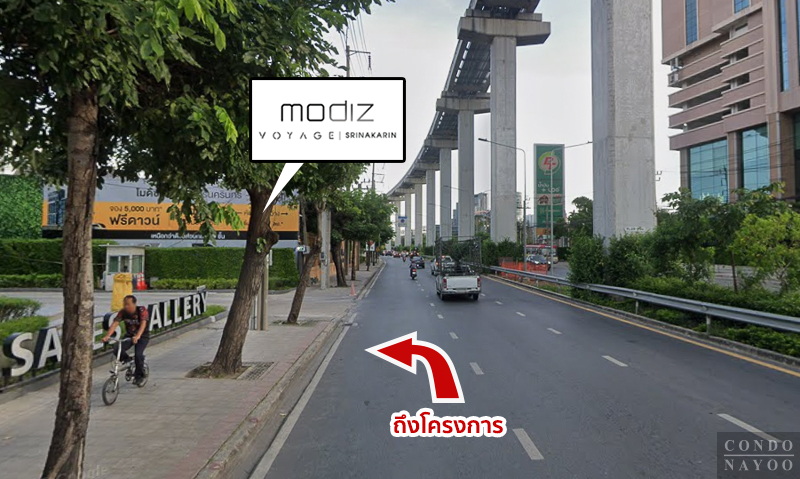 ถนนพระราม 9 ⇒ ถนนศรีนครินทร์ ⇒ ถึงโครงการ Modiz Voyage ศรีนครินทร์ ทางฝั่งซ้ายมือ