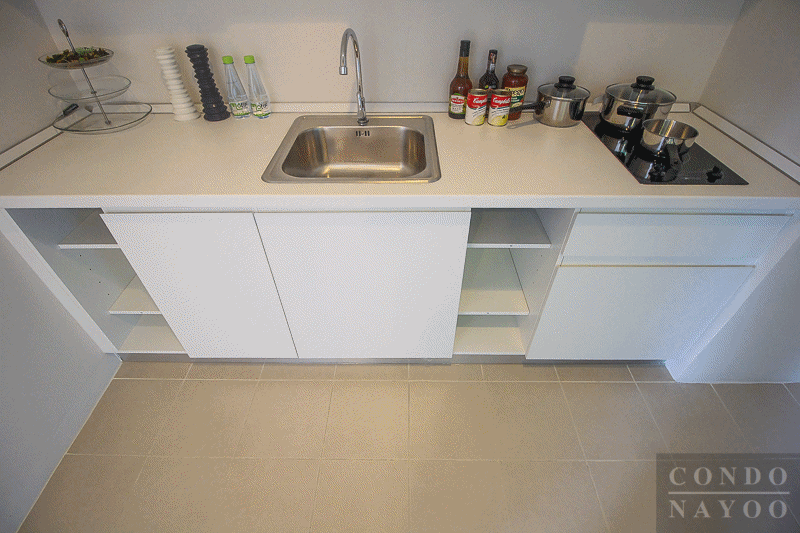 พื้นที่เตรียมอาหารบนเคาน์เตอร์ครัวค่อนข้งกว้าง ติดตั้งซิ้งค์ล้างจานและเตาไฟฟ้ามาให้ตามนี้เลย ส่วน Top เคาน์เตอร์ครัวใช้ Particle Board สีขาว (ไม้อัด) จึงอาจจะต้องระวังเรื่องความชื้นหน่อย เวลาเปียกต้องรีบเช็ดนะ ส่วนผนังด้านหลังเป็นผนังฉาบเรียบธรรมดาๆ แนะนำให้ติดเป็นกระเบื้องหรือกระจกเพิ่ม จะได้เช็ดคราบมันง่ายๆค่ะ