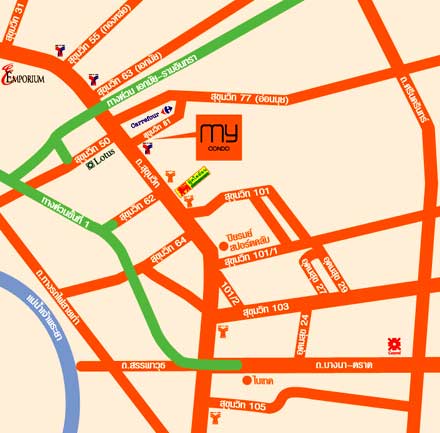 การเดินทางเริ่มจากถนนสุขุมวิท ⇒ BTS พร้อมพงษ์ ⇒ BTS เอกมัย ⇒ BTS พระโขนง ⇒ แยกอ่อนนุช ⇒ ซอยสุขุมวิท 81 ตรงไปอีก 230 เมตร ถึงโครงการ My Condo สุขุมวิท 81