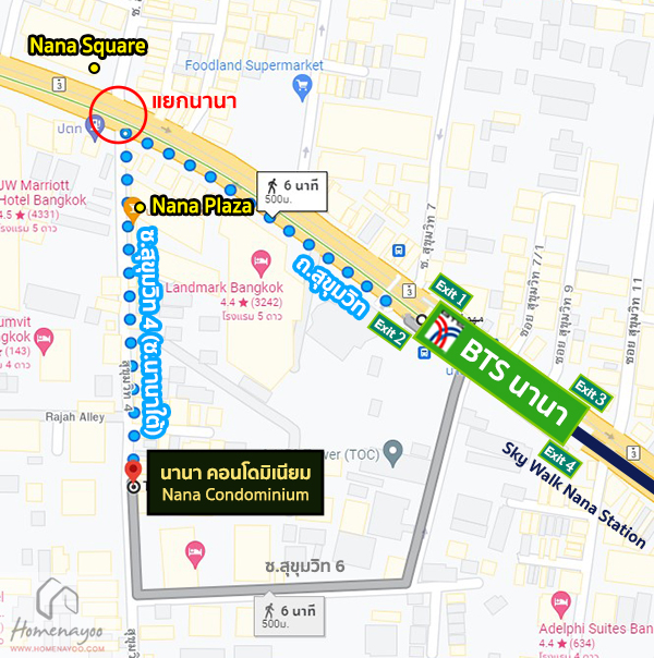 จากปากซอยสุขุมวิท 4 (ซอยนานาใต้) ไปโครงการ นานา คอนโดมิเนียม ประมาณ 250 เมตร*