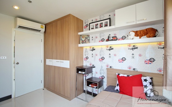 ผนังหัวเตียงตกแต่งวอลเปเปอร์ลายธงชาติอังกฤษ ด้านบนบิวท์อินชั้นและตู้เก็บของสีขาว พอดีกับผนัง ต่อเนื่องไปเป็นโต๊ะหัวเตียง 2 ตัว วางเล่นระดับ มีช่องสำหรับเก็บของได้เล็ก ๆ น้อย ๆ และสุดท้าย บริเวณด้านหลังประตู บิวท์อินตู้เสื้อผ้าบานเปิดสีวอลนัท ขนาด 1.5 เมตร ด้านในติดตั้งไฟ LED ไว้ให้เช่นเดียวกัน เหนือประตูห้องพัก ติดตั้งเครื่องปรับอากาศ Mitsubishi ขนาด 10,000 BTU ไว้ให้ 1 เครื่องค่ะ