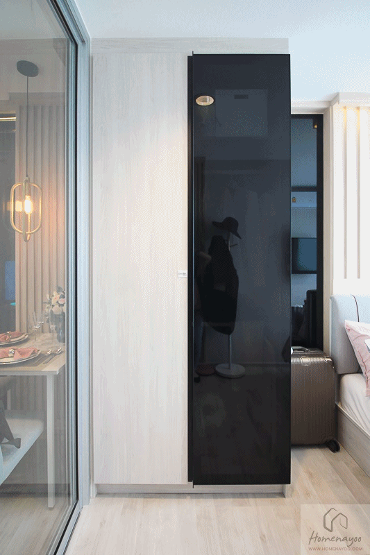ส่วนพื้นที่ปลายเตียงนอนก็ยังเหลือพอให้เราสามารถเดินผ่านได้ และยังติดทีวีแบบแขวนผนังได้ด้วยcloset
