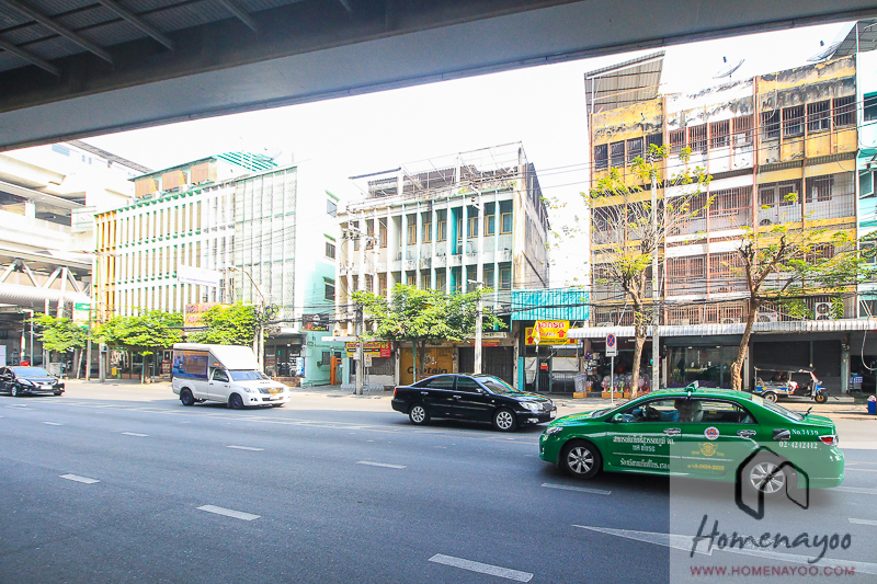 บรรยากาศฝั่งตรงข้ามจะเป็นอาคารพาณิชย์เช่นกัน ซึ่งจะมีทั้งร้านกาแฟ ร้านขายเครื่องใช้ไฟฟ้าและร้านอาหารค่ะ