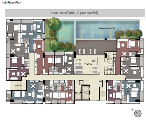ผังโครงการชั้น 4 จะเป็นชั้นที่มีพื้นที่ส่วนกลางหลัก ประกอบด้วย สระว่ายน้ำ, Pool Terrace ขนาดค่อนข้างกว้างและ ฟิตเนสในร่ม ขนาดไม่ใหญ่เท่าไหร่ค่ะ