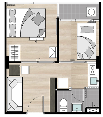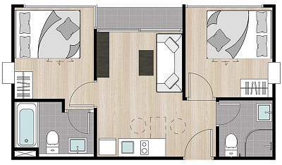 แบบ 2 Bedrooms 2 Bathrooms ขนาด 53.47 ตร.ม.