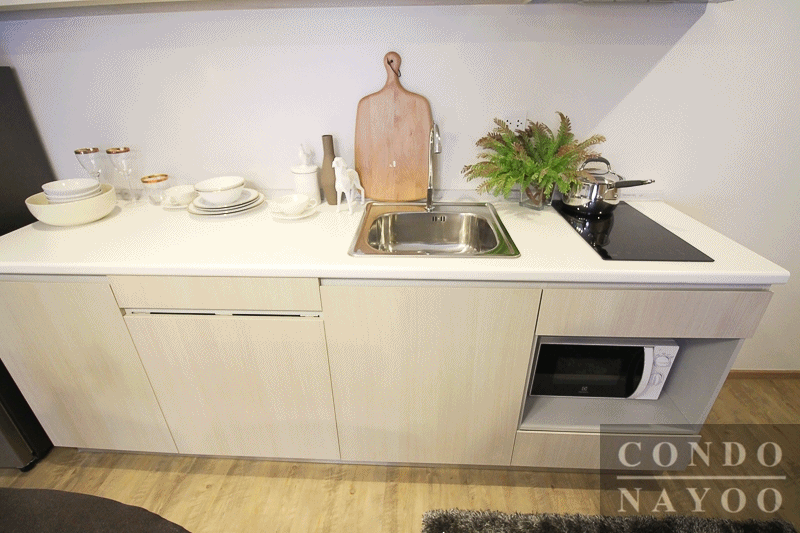 สำหรับครัวได้หน้าตาแบบนี้เลยเป็นมาตรฐาน ไม่รวมเครื่องใช้ไฟฟ้า สเป็กวัสดุต่างๆ เหมือนกับห้องแรกที่เราไปดูกันมาเมื่อครู่
