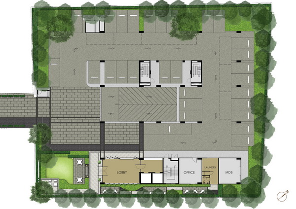 ที่ดินโครงการคอนโด Notting Hill เจริญกรุง เป็นรูปสี่เหลี่ยม โดยผังชั้นล่างจะเป็นส่วนที่จอดรถใต้อาคารและโถงลิฟต์ค่ะ นับที่จอดรถรวมจอดซ้อนคันคิดเป็นประมาณ 58% ของจำนวนยูนิตโครงการ รวมจอดซ้อนคัน เข้ามาฝั่งขวามือจะมีสวนหย่อมและล็อบบี้ของโครงการ และประตูที่ต้องสแกนการ์ดเปิดเข้าไปโถงลิฟท์และห้องจดหมายของอาคาร มีลิฟต์โดยสาร 2 ตัวระบบล็อกชั้น ซึ่งถ้าเทียบกับจำนวนยูนิตของโครงการที่มี 132 ก็จัดว่ากำลังเหมาะสม สบายๆไม่แออัดค่ะ เดี๋ยวเราพาไล่ดูบรรยากาศโครงการกันไปทีละส่วนนะคะ