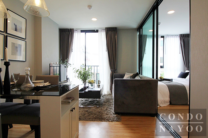 ห้องตัวอย่างห้องที่สองที่จะพาไปชมเป็นห้องแบบ 1 Bedroom ขนาด 30.5 ตร.ม.โดยโครงการขายแบบ Fully Fitted โดยจะมาพร้อมเครื่องปรับอากาศ ชุดครัว เครื่องทำน้ำอุ่น และฉากกั้นอาบน้ำ การจัดผังห้องเปิดเข้ามาในห้องจะเป็นส่วนครัวเปิดฝั่งซ้าย ตรงไปเป็นส่วนห้องนั่งเล่นติดระเบียง ถัดไปเป็นห้องนอนซึ่งมีฉากกั้นห้องมาให้เป็นสัดส่วน พร้อมห้องน้ำในตัว ตัวห้องจะเป็นอย่างไรไปชมกันเลย