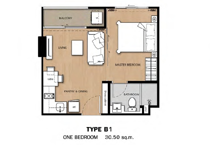 1 ห้องนอน Type B2 ขนาด 27.00 ตร.ม.