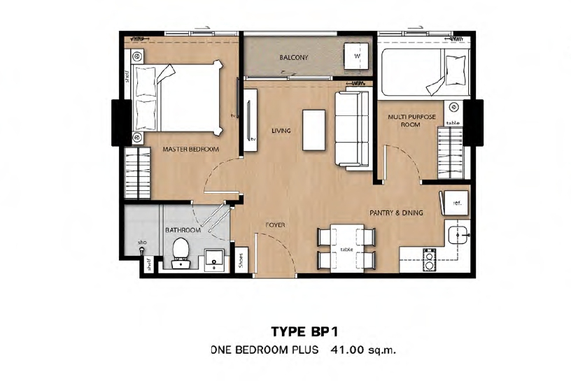 ห้องตัวอย่างห้องแรกที่จะพาไปชมเป็นห้องแบบ 1 Bedroom Plus ขนาด 41 ตร.ม.โดยโครงการขายแบบ Fully Fitted โดยจะมาพร้อมเครื่องปรับอากาศ ชุดครัว เครื่องทำน้ำอุ่น และฉากกั้นอาบน้ำ การจัดผังห้องเปิดเข้ามาในห้องจะเป็นส่วนครัวเปิดฝั่งขวา ประตูห้องน้ำฝั่งซ้าย ตรงไปเป็นส่วนห้องนั่งเล่นติดระเบียง ถัดไปเป็นห้องนอนซึ่งกั้นห้องพร้อมประตูบานปิดมาให้เป็นสัดส่วน พร้อมห้องอเนกประสงค์อีกห้องที่สามารถใช้เป็นห้องนอนเล็กได้ เป็นห้องแบบหน้ากว้างที่ให้มุมมองที่ดูกว้างขวาง และใช้งานได้เต็มพื้นที่ดีค่ะ ตัวห้องจะเป็นอย่างไรไปชมกันเลย