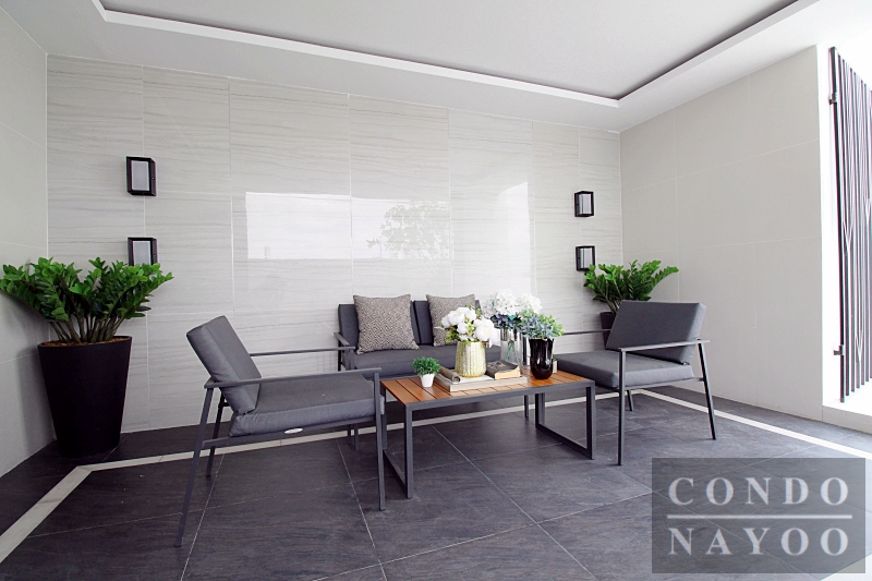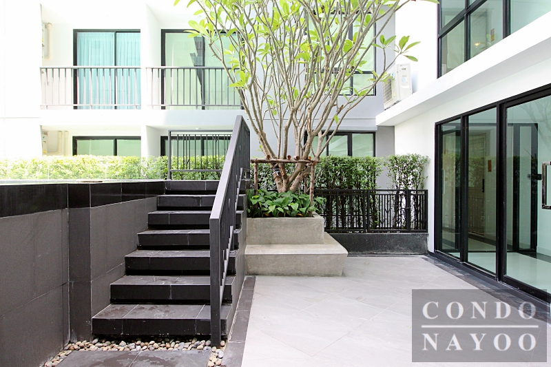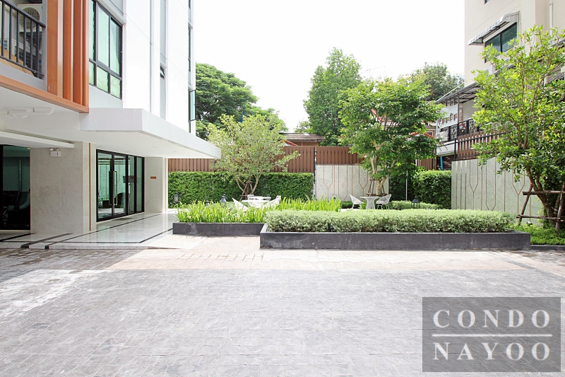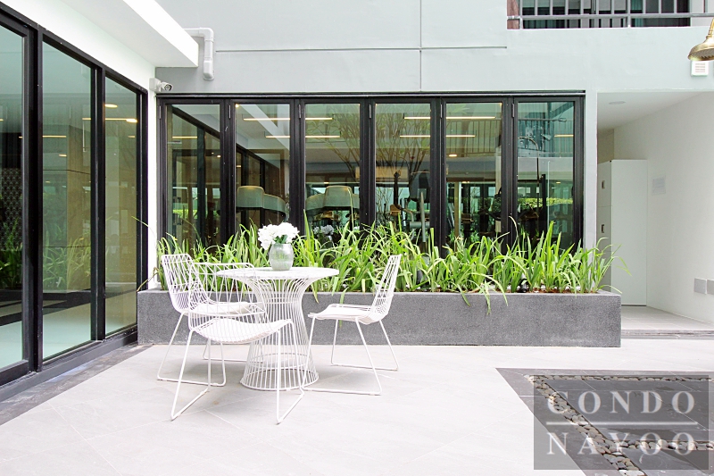 ทางฝั่งขวามือของโครงการจะเป็นสวนหย่อมสำหรับนั่งพักผ่อนและทางเข้าไปส่วนล็อบบี้ด้านในอาคาร
