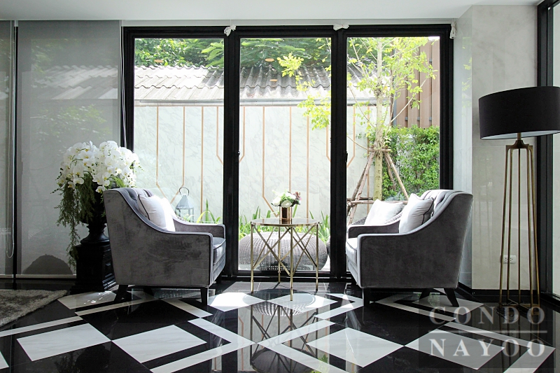 จากห้องนั่งเล่นจะมีประตูบานเลื่อนแบบ 2 ตอน กรอบอลูมิเนียมสีดำ ที่เปิดออกมาระเบียงได้ มือจับเป็นแบบเซาะร่องมาตรฐาน ประตูบานนี้เวลาที่ปิดก็ทำหน้าที่เป็นช่องแสงธรรมชาติให้กับห้องนั่งเล่นไปในตัว