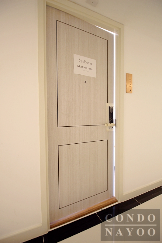 ประตูที่ได้จะเป็นบาน HDF กรุลามิเนตลายไม้ มีเซาะร่องเป็นลายได้แบบที่เห็น และมีตาแมวให้ส่องดูคนที่มาเคาะประตูได้ และมีป้ายบอกเลขห้องสีทองติดอยู่ที่ผนังข้างประตู