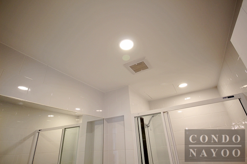 ผนังติดกระเบื้องมาให้จรดเพดาน ที่เพดานเหนือโถสุขภัณฑ์จะมีพัดลมดูดอากาศติดมาให้ช่วยระบายอากาศ
