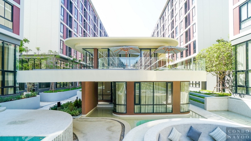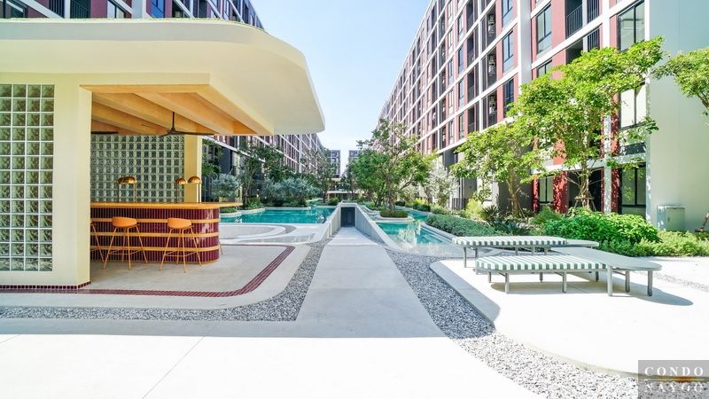 ⇒ การออกแบบโครงการ, ห้องพักและวัสดุ : ลักษณะโครงการเป็นคอนโด Low Rise สูง 8 ชั้น จำนวน 2 อาคาร บนที่ดินประมาณ 11 ไร่ จำนวนห้องชุดพักอาศัย 1,206 ยูนิต ออกแบบสถาปัตยกรรมสไตล์ ‘Mid Century Modern Architecture in 60S’ โดยวางเส้นสายของงานสถาปัตยกรรมที่มีความเรียบง่าย มีเอกลักษณ์ เลือกใช้สีและจังหวะอย่างลงตัว