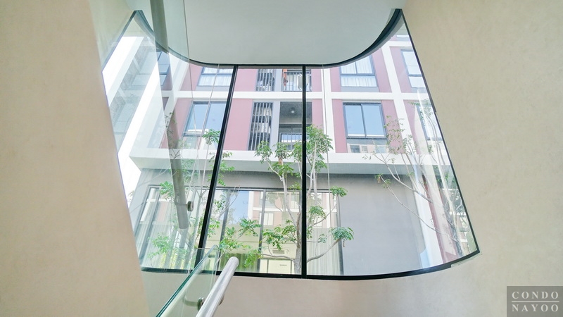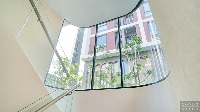 และอีกหนึ่ง Highlights ของห้อง Duplex คือจะมีโถงแบบ Double Volume ความสูงถึง 5.25 ม. ก่อนจะออกไปที่ระเบียง ผนังด้านบนมีช่องแสงบานฟิกซ์ขนาดใหญ่ติดมาให้ ทำให้ห้องพักทั้งชั้น 1 และ 2 ได้รับแสงสว่างอย่างเต็มที่ สามารถมองวิวสระ หรือวิวสวนตามยูนิตที่เลือกได้ตลอดทั้งวัน