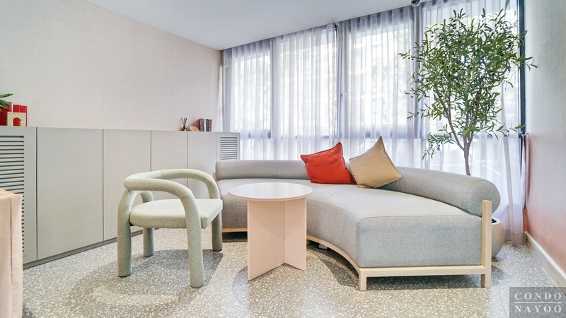 ถัดไปเป็น Living Area ได้ชุดโซฟาสีเทาขนาด 2 ที่นั่ง พร้อมโต๊ะกลางด้านหน้า โดยเป็นพื้นที่ที่อยู่ติดกับระเบียงเลย