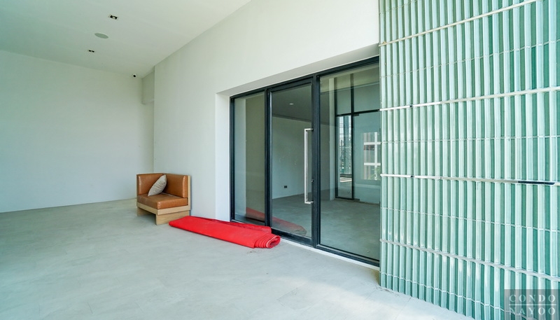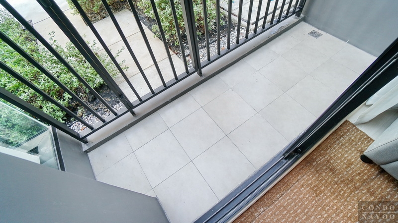 ถัดมาเป็นส่วนของระเบียงพักผ่อนด้านนอกแบบ Garden Access โดยใช้เป็นประตูกระจกบานเลื่อนกรอบอะลูมิเนียมสีดำบานใหญ่ มีการยกธรณีและวงกบสูงขึ้นมาประมาณ 10 ซม.* เพื่อป้องกันฝุ่น, น้ำฝน หรือสิ่งสกปรกต่าง ๆ ไม่ให้พัดเข้าสู่ห้องพักโดยตรง ขนาดระเบียงกว้างกำลังดี ปูพื้นด้วยกระเบื้องเซรามิกกันลื่นขนาด 30 x 30 ซม.