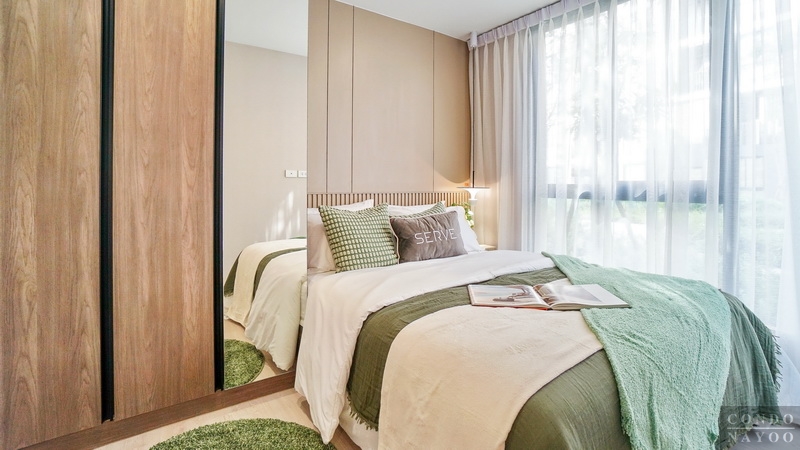 ภายในได้พื้นที่ใช้สอยมากว้างกำลังพอดี ได้เฟอร์นิเจอร์มาตรฐานมาครบชุดเลย ทั้งฐานเตียงนอนลายไม้ขนาด 5 ฟุต และตู้เสื้อผ้า 3 บานเปิด