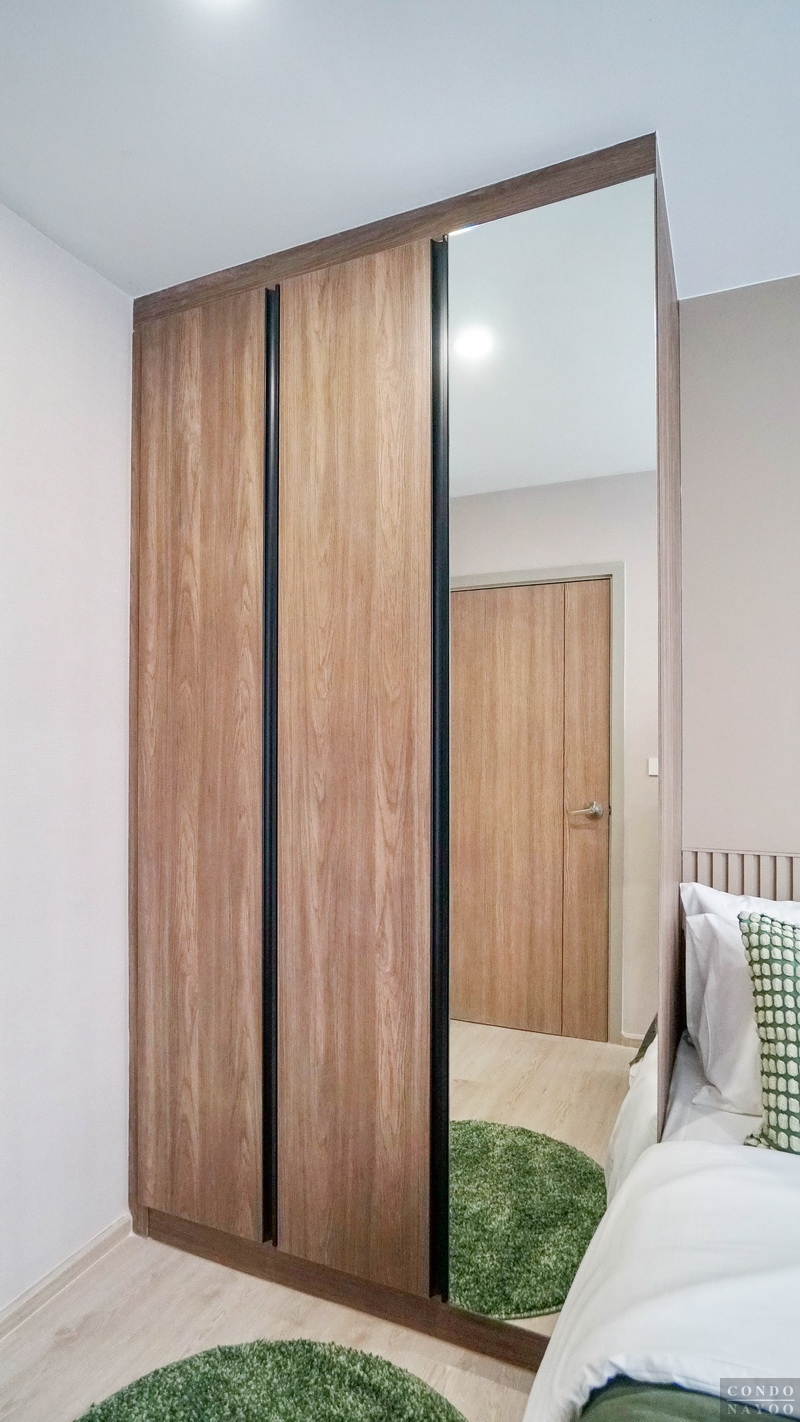 พื้นด้านล่างมีที่เหลือกว้างให้ยืนแต่งตัว เลือกหยิบเสื้อผ้าในตู้ หรือเดินเข้า-ออกได้อย่างสบาย ๆ โดยตำแหน่งของตู้เสื้อผ้าจะอยู่ติดกับทางเข้าห้องน้ำพอดี จึงสามารถใช้งานต่อเนื่องกันได้อย่างสะดวก