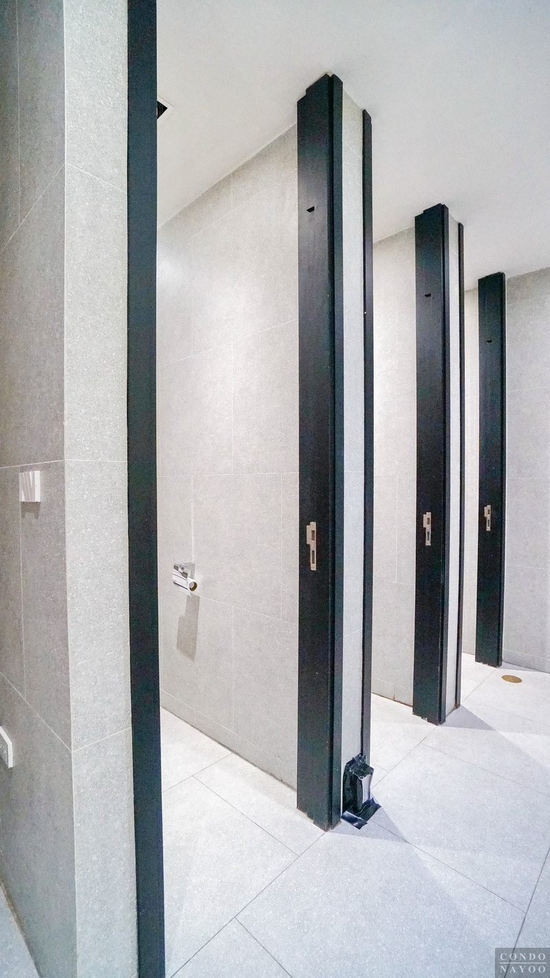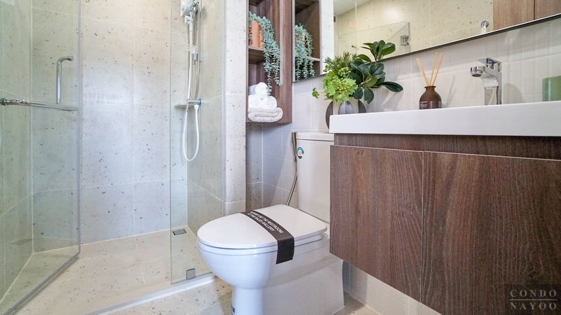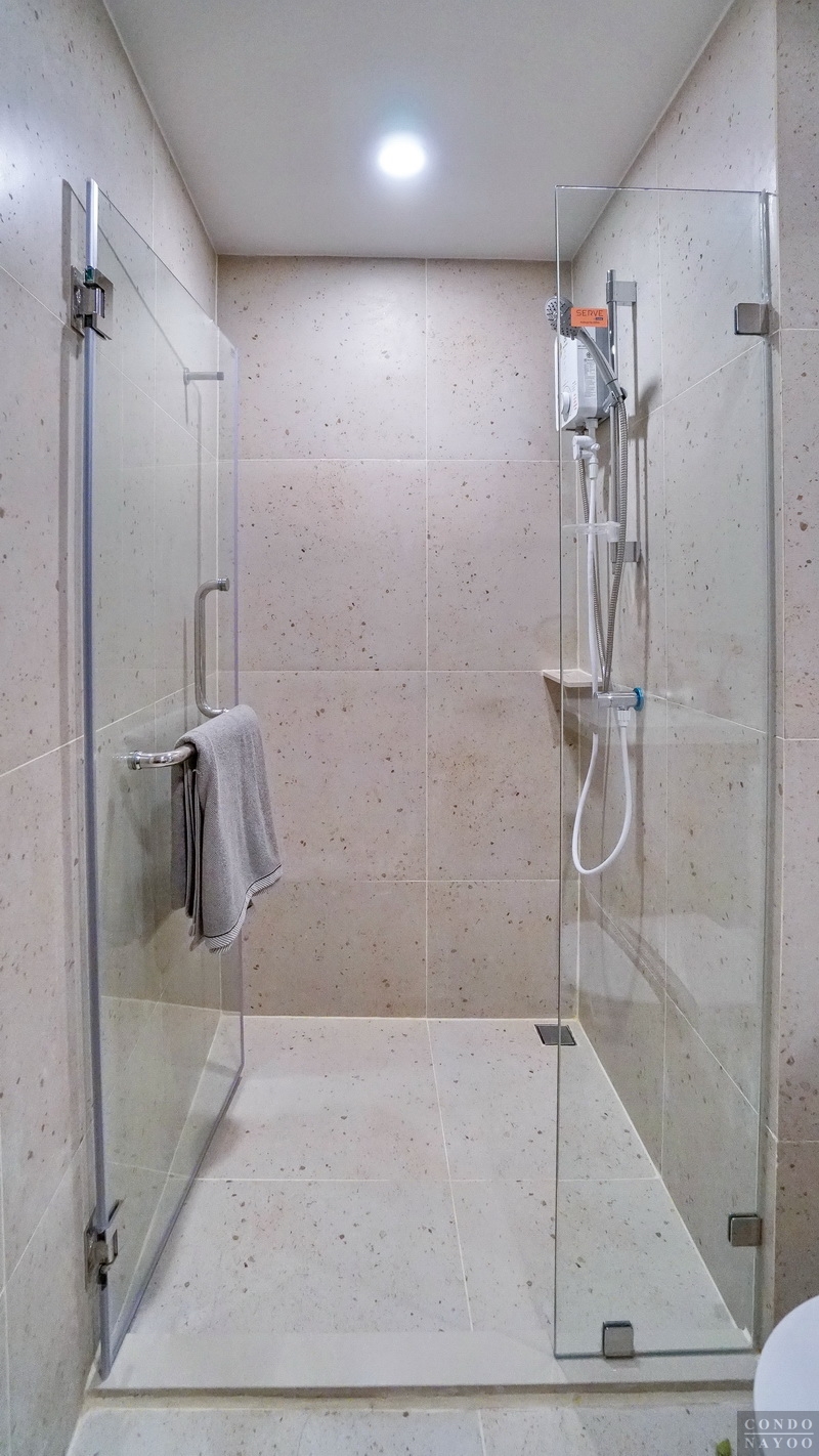 ถัดเข้าไปด้านในคือมุมอาบน้ำที่ทางโครงการได้ติดตั้ง Shower Box แบบบานเปิดมาให้ ทางเข้าธรณีเป็นหินแกรนิตพื้นยกสูงขึ้นมา 1 Step กันน้ำไหลออกมาด้านนอก ส่วนพื้นที่ภายในมีความกว้างกำลังดี ยืนอาบน้ำ ขัดผิวได้สบาย ๆ