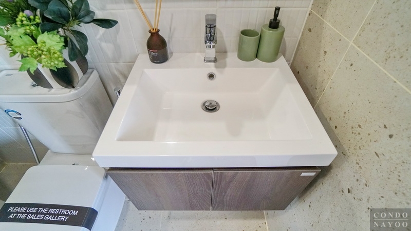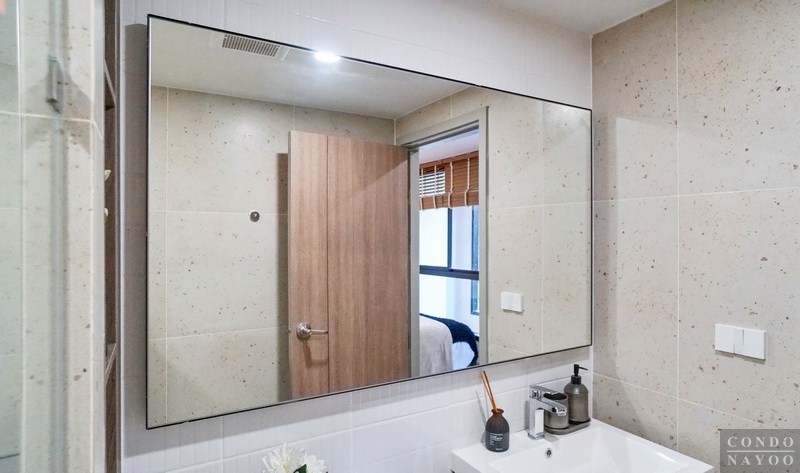 มีท่อน้ำทิ้งและก็อกน้ำให้อย่างละ 1 จุด ผนังฝั่งขวาคิดโคมไฟกิ่งให้แสงสว่าง 1 ดวง ส่วนอีกฝั่งจะเป็นกระจกบานฟิกซ์แบบเข้ามุมของห้องนอน 1