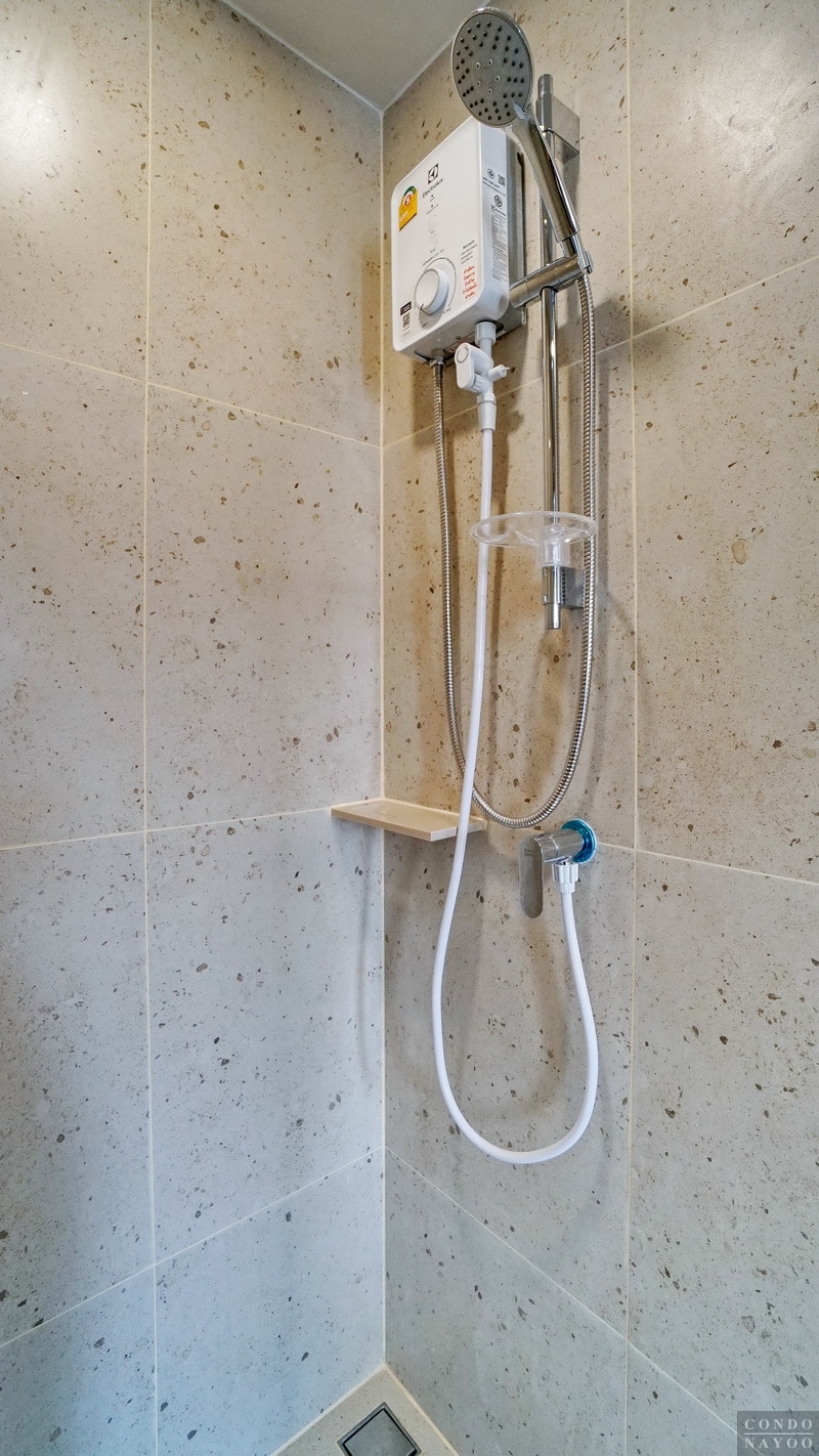 ภายในติดฝักบัว Hand Shower พร้อมราวปรับระดับสูง-ต่ำ ของ American Standard มาให้ ผนังข้าง ๆ ติดชั้นวางของและที่วางสบู่ฝังผนังหินสังเคราะห์สีขาว บนผนังมีการเดินงานระบบไฟฟ้าติด Junction Box รองรับการติดตั้งเครื่องทำน้ำอุ่นมาให้เรียบร้อย