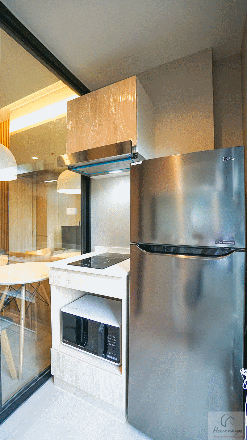 เดินเข้าห้องมาส่วนแรกเป็นส่วนครัว ได้เป็นครัวเปิดเชื่อมกับส่วนรับประทานอาหาร และห้องนั่งเล่น ให้พื้นที่มาพอสมควร ห้องนั่งเล่นอยู่ติดระเบียง เปิดมุมมองรับวิวด้านนอกได้ ส่วนของห้องนอนเชื่อมต่อกับห้องนั่งเล่น สามารถกั้นห้องเองด้วยกระจกบานเลื่อนได้ หรือจะเปิดโล่งไปเลยก็ได้ ส่วนห้องนอนวางเตียง โต๊ะ ตู้ ได้ครบ ห้องน้ำเชื่อมต่อกับห้องนอน