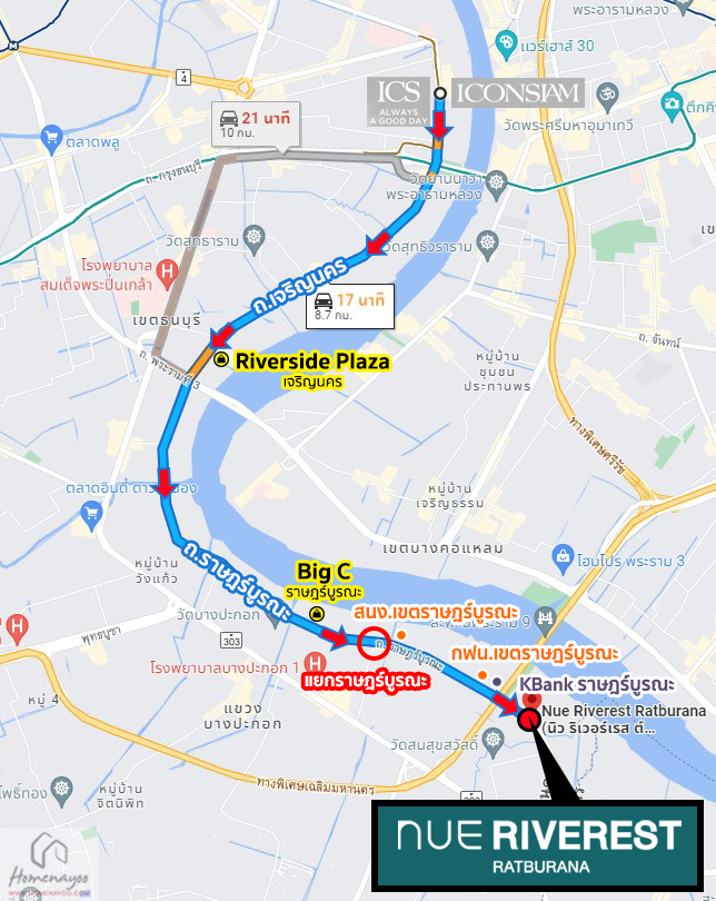 การเดินทางเริ่มจาก ICONSIAM ⇒ ถนนเจริญนคร ⇒ แยกราษฎร์บูรณะ ⇒ ถนนราษฎร์บูรณะ ⇒ Nue Riverest ราษฎร์บูรณะ