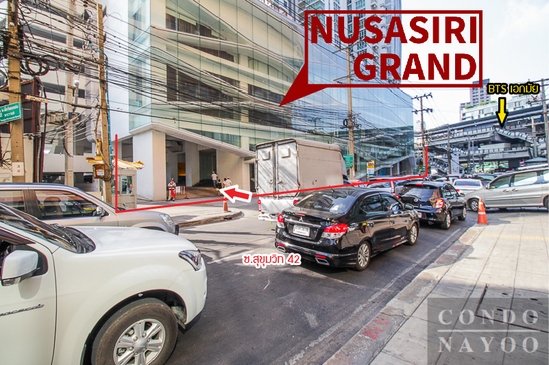 ที่ตั้งโครงการ Nusasiri Grand Condo ตั้งอยู่ติดถนนสุขุมวิทฝั่งเลขคู่ ตรงปากซอยสุขุมวิท 42 เยื้องๆแยกเอกมัย ทางเข้าโครงการเข้าได้ทั้งจากฝั่งถนนสุขุมวิท และจากในซอยสุขุมวิท 42 ฝั่งในซอยจะได้ทั้งเข้าและออก และเนื่องจากซอยสุขุมวิท 42 เป็นซอย One way วิ่งมาจากฝั่งถนนพระรามสี่มาออกถนนสุขุมวิทเท่านั้น ส่วนซอยสุขุมวิท 40 เป็นซอย One way ที่วิ่งจากฝั่งสุขุมวิทไปออกถนนพระรามสี่ แต่มีซอยสุขใจที่เชื่อม 2 ซอยนี้อยู่ ถ้าจะเข้าโครงการฝั่งซอย 42 มาจากทองหล่อก็มาเลี้ยวเข้าสุขุมวิท 40 มาเข้าซอยสุขใจเพื่อมาออกสุขุมวิท 42 อีกทีครับ แต่ถ้าจากเข้าจากฝั่งถนนสุขุมวิทมาจากฝั่งทองหล่อต้องไปกลับรถช่วงซอยสุขุมวิท 44/2 ครับ