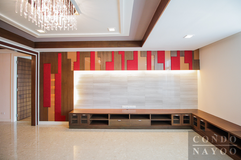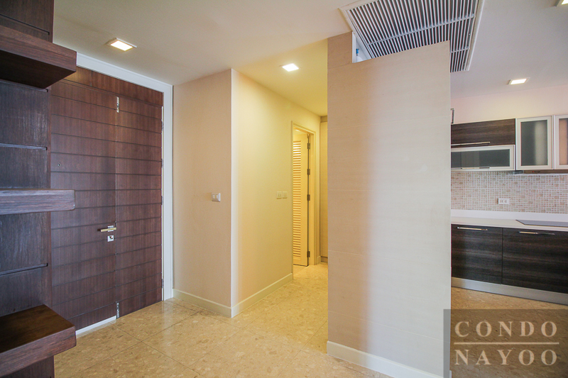 เดินเข้าห้องมาจะเจอโถงทางเดิน ซ้ายมือเป็นห้องน้ำ ถัดไปเป็นห้องครัว ส่วนรับประทานอาหาร และห้องนั่งเล่น ขวามือเป็นห้องนอน 2 และ 3 ฝั่งซ้ายเป็นห้อง Master Bedroom พื้นห้องเป็นกระเบื้องลายหินอ่อน ฝ้าสูง 2.5 ม. และส่วนที่เป็นฝ้าผลุมสูง 2.6 ม.
