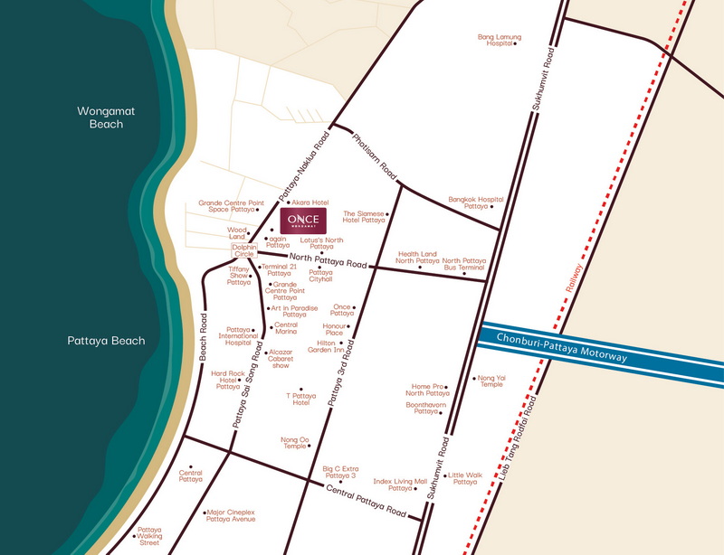 Once วงศ์อมาตย์ คอนโดสุดหรูโครงการใหม่ จาก Honour Group ตั้งอยู่ในทำเลเด่นย่านพัทยาเหนือ ใกล้วงเวียนปลาโลมา สถานที่ที่ถือเป็นจุดแลนด์มาร์ค รายล้อมด้วยห้างสรรพสินค้า, โรงแรมระดับห้าดาว และร้านอาหารชื่อดังมากมาย ตอบโจทย์การใช้ชีวิตที่สะดวกสบายและครบครัน พร้อมวิวทะเลแบบพาโนรามาที่ครอบคลุมทั้งหาดวงศ์อมาตย์และหาดพัทยา
