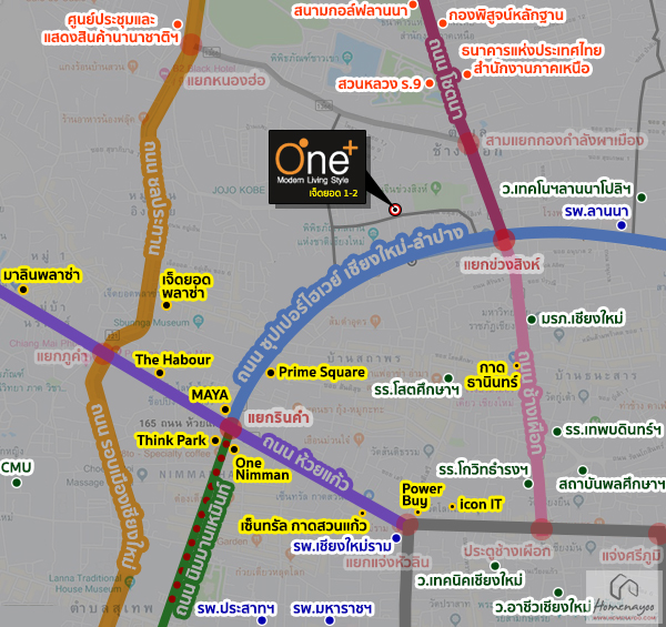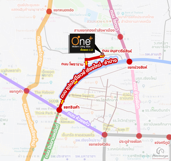 การเดินทางเริ่มจาก ถ.นิมมานเหมินท์ แยกรินคำ ⇒ ถ.ซุปเปอร์ไฮเวย์ เชียงใหม่-ลำปาง ⇒ ถ.โพธาราม เลี้ยวเข้า ถ.อนุสาวรีย์สิงห์ ขับตรงไปอีก 300 ม. ถึงโครงการ One Plus เจ็ดยอด 2
