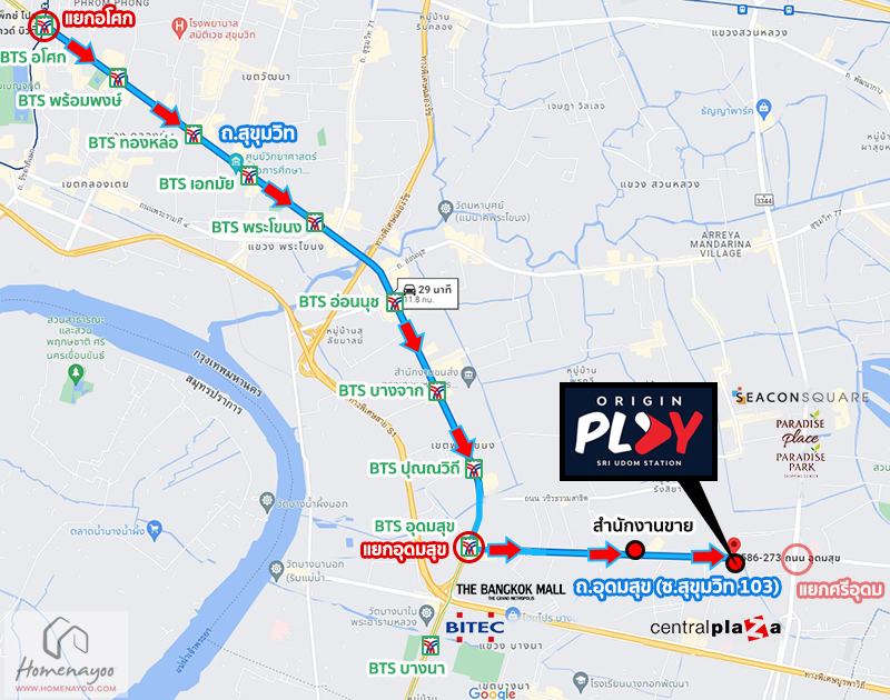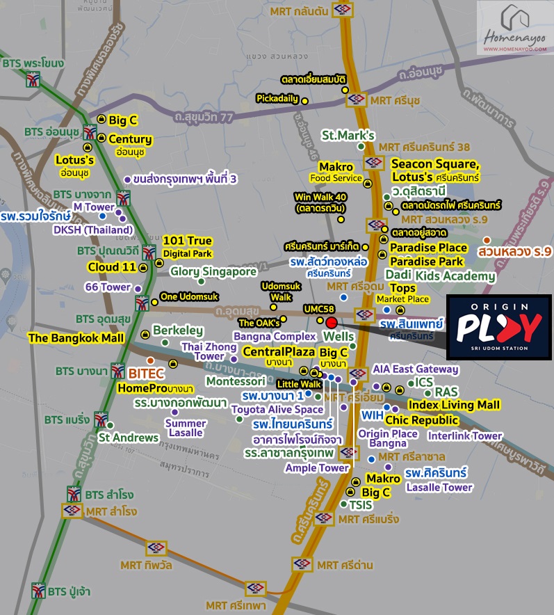 ♦ ทำเลที่ตั้งโครงการ : Origin Play Sri Udom Station ตั้งอยู่บนทำเลศักยภาพในซอยสุขุมวิท 103 หรือถนนอุดมสุข โดยที่ตั้งจะอยู่ค่อนไปทางถนนศรีนครินทร์ แต่ก็สามารถเชื่อมต่อกับถนนสุขุมวิทได้ง่ายไม่แพ้กัน จากโครงการจะใกล้ถนนเส้นหลัก ทางด่วน และรถไฟฟ้าถึง 2 สาย