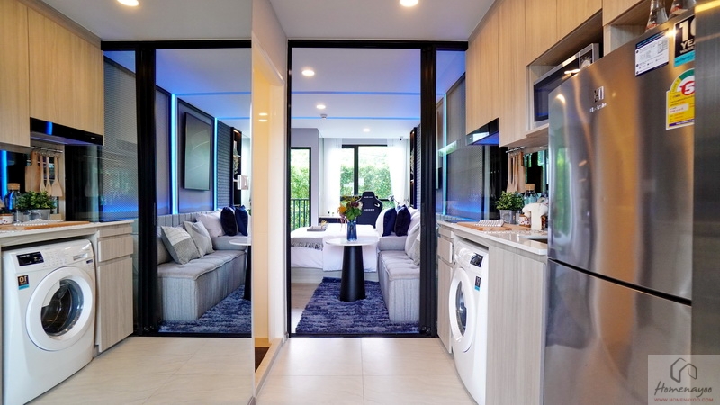 เริ่มกันที่ห้องแรก 1 Bedroom Studio (B1) ขนาด 23.00 ตร.ม. ที่เป็นห้อง Size เริ่มต้นของโครงการ เปิดประตูเข้ามาเราจะเจอกับ Service Area กันก่อน โดยจะประกอบไปด้วยห้องครัวปิด และห้องน้ำ แยกโซนด้วยประตูกระจกบานเลื่อน 3 ตอนมาให้