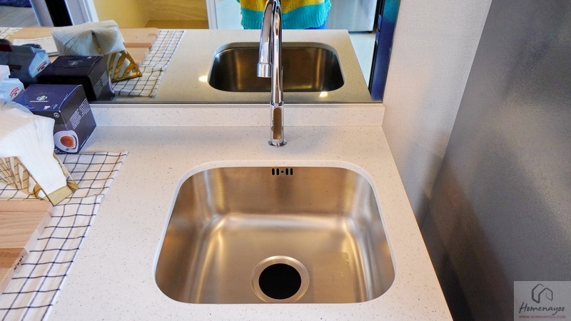 ใต้ซิงค์ล้างจานมีตู้เก็บของบานเปิดให้ 1 ตู้ ที่พื้นติดแผ่นอะลูมิเนียมกันน้ำมาให้ และมีเต้าเสียบปลั๊กไฟด้านในให้ด้วย 1 จุด เหมาะสำหรับทำเป็นตู้เก็บอุปกรณ์ทำความสะอาด หรือเครื่องมือช่างประจำบ้าน
