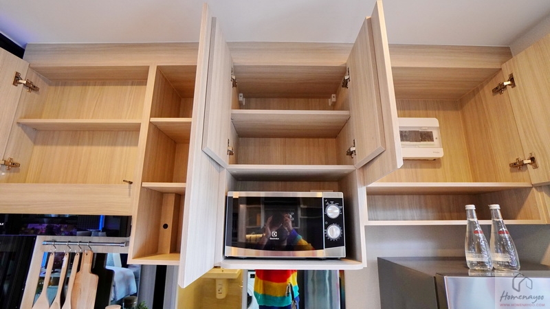 ด้านบนได้ตู้เก็บของบานเปิด พร้อมชั้นลอยย่อย ๆ ออกมาหลายช่อง ช่วยให้เก็บของได้เยอะ และเป็นระเบียบดี ทั้งยังมีช่องสำหรับวางไมโครเวฟขนาดมาตรฐานมาให้ด้วย 1 ช่องค่ะ
