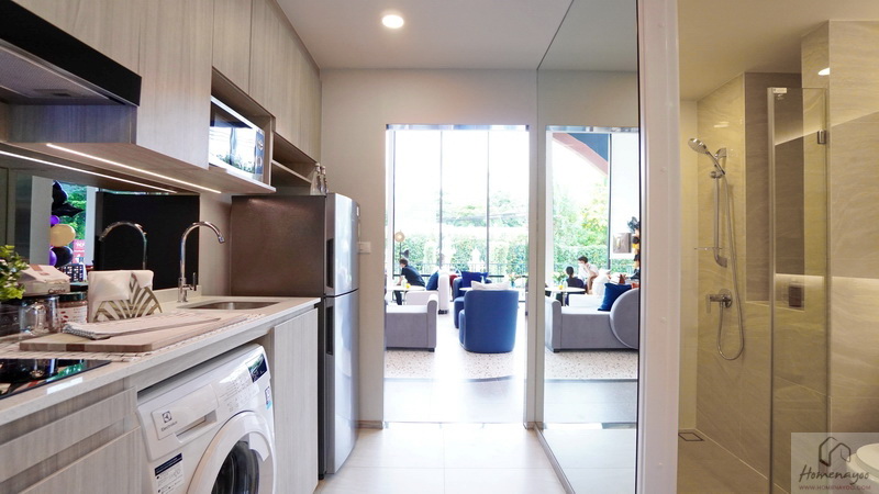 ชุดครัวที่ให้มาดีไซน์ออกมาได้สวยดี ได้ตู้เก็บของด้านบนและด้านล่างที่ปิดผิวด้วยเมลามีนลายไม้ และมีช่องว่างด้านล่างไว้สำหรับวางเครื่องซักผ้าฝาหน้า ขนาด 7 กก. โดยด้านหลังจะมีการเดินงานระบบท่อน้ำดี ท่อน้ำทิ้ง และเต้าเสียบปลั๊กไฟมาให้ครบ