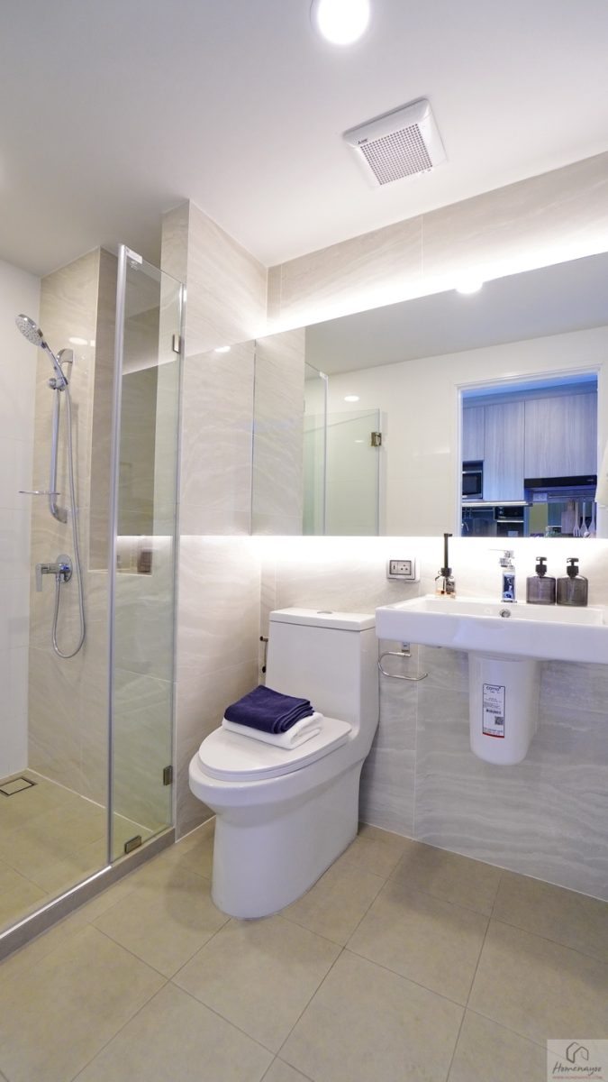 ห้องน้ำเป็นห้องหน้ากว้าง มีระยะใช้งานสบาย ๆ ใช้กระเบื้องพื้น-ผนังคุมโทนสีเทาและสีขาว ดูหรูหรา และสีอ่อน ๆ จะช่วยให้ห้องน้ำดูกว้างมากขึ้น ภายในจะมีการแบ่งส่วนแห้ง และกั้นส่วนอาบน้ำมาให้เรียบร้อย สุขภัณฑ์มาตรฐานติดตั้งมาให้ตำแหน่งตามภาพ โดยใช้เป็นของ Cotto ผนังส่วนแห้งได้กระจกเงาบานใหญ่เต็มผนังแบบในภาพเลยค่ะ