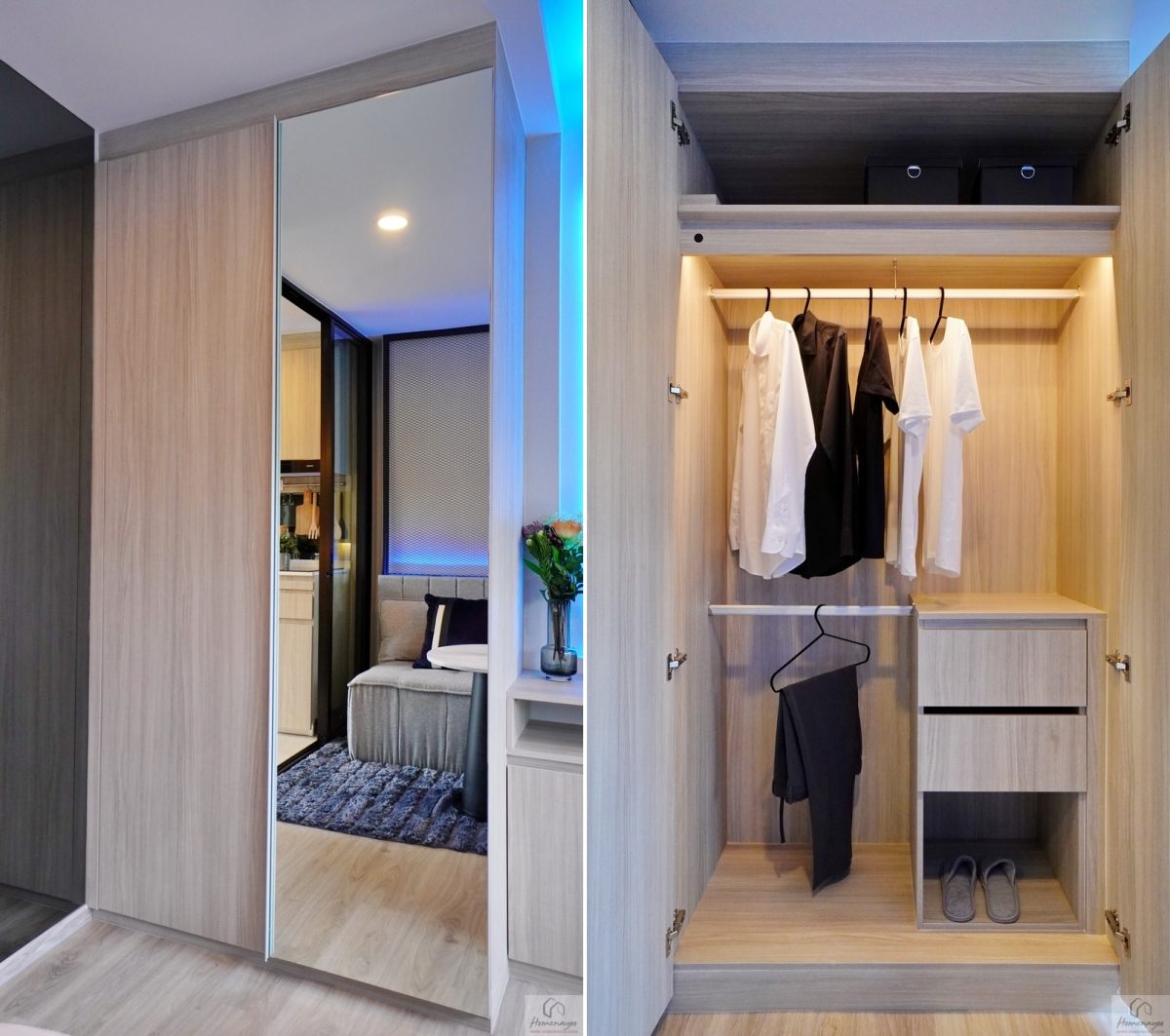 ส่วนแรกจะได้ตู้เสื้อผ้าบานเปิด ฟังก์ชันครบ พร้อมกระจกเงาที่หน้าบานให้ยืนส่องได้เต็มตัว ภายในตู้จะได้รูปแบบเดียวกันกับห้องตัวอย่างก่อนหน้านี้ทุกประการ ส่วนพื้นที่คงเหลือด้านหน้า ถือว่าเหลือกว้างเลยนะ สามารถเปิดตู้เสื้อผ้า เลือกหยิบของแต่งตัวได้สะดวกมากทีเดียวค่ะ
