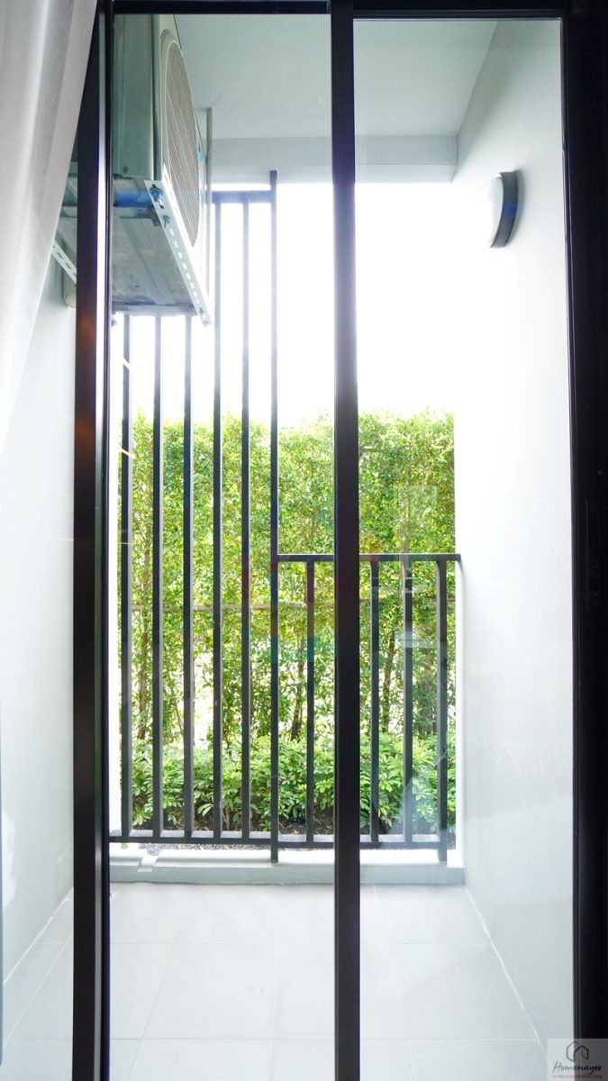 ระเบียงกันตกต่อเนื่องไปกับกริลบังแอร์ความสูงจรดฝ้าเพดาน โดยวัสดุที่ใช้จะเป็นระแนงเหล็กแนวตั้งทาสีดำกันสนิม ซ้ายมือเป็นที่ตั้งของ CDU 1 ตัว และที่ผนังฝั่งขวาจะมีการติดโคมไฟกิ่งทรงกลมมาให้ 1 ดวงค่ะ