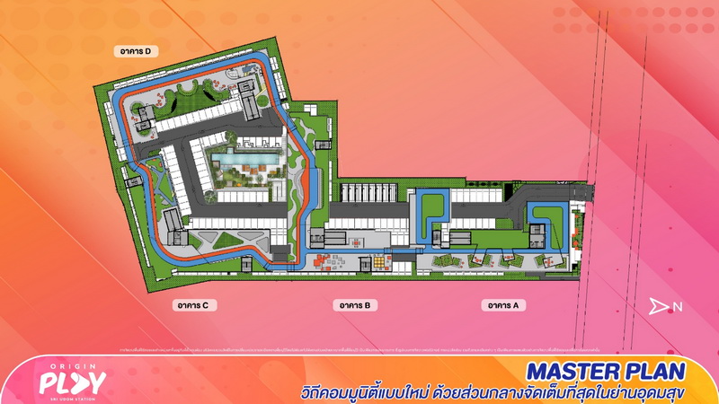 ♦ การออกแบบโครงการ : โครงการ Origin Play Sri Udom Station เป็นคอนโดเลี้ยงสัตว์ได้แห่งแรกบนถนนอุดมสุข มีแนวคิดมาจากการ LEGO โดยมีการนำ Element หลาย ๆ รูปร่างและแตกต่างกันมาผสมผสานอย่างลงตัว โดยจะเน้นการใช้โทนสีจัดจ้าน อย่างสีน้ำเงิน และสีส้ม สะท้อนถึงความสนุกที่และความหลากหลายของแบรนด์ Origin Play ที่ทำออกมาเพื่อรองรับคนรุ่นใหม่ ชาว GEN Z และ GEN Y โดยเฉพาะ
